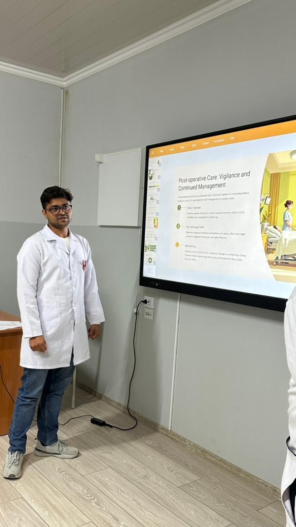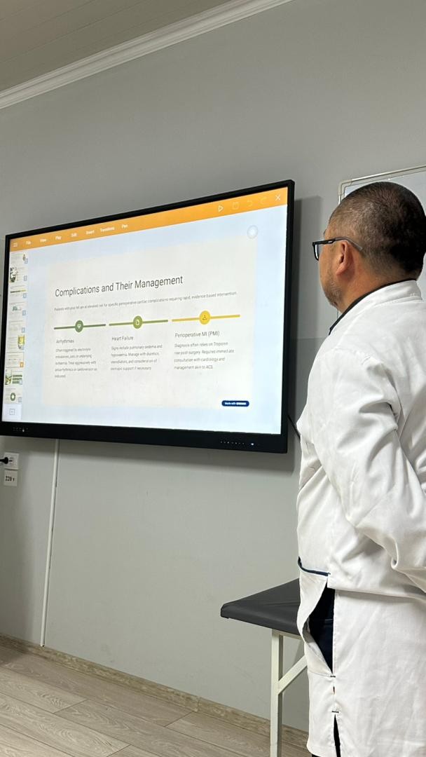 В рамках декады открытых занятий в Ошском международном медицинском университете преподаватель кафедры клинических дисциплин Эргешбаев Медер провёл открытое занятие для студентов 5 курса, группы ЛД5-4-21 (В) по теме «Methods of complex resuscitation and intensive therapy in case of circulatory arrest. Heart rhythm disorders. Myocardial infarction. Cardiogenic shock».