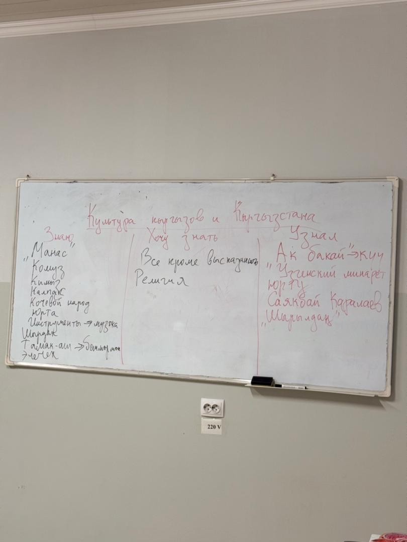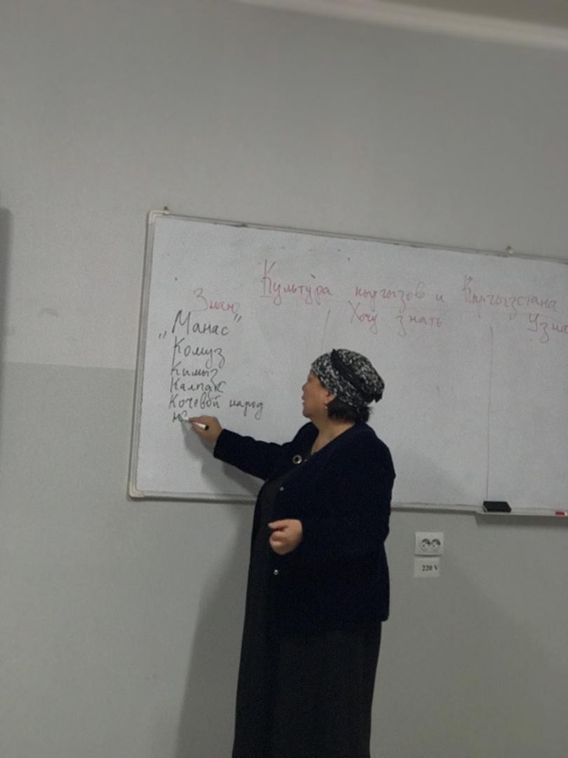 Во время урока были рассмотрены важнейшие этапы развития кыргызской культуры, её традиции, духовные и материальные ценности, а также вклад кыргызского народа в историческое и культурное наследие Центральной Азии.